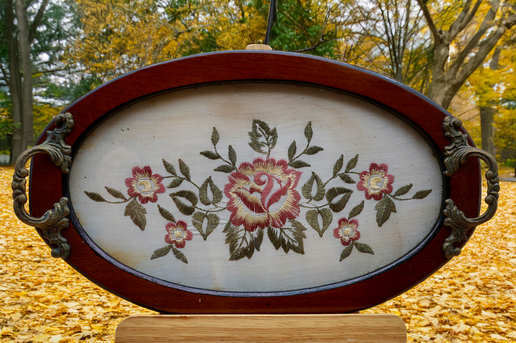 お花に囲まれた女性の刺繍画